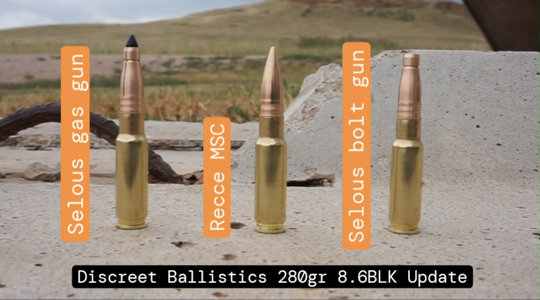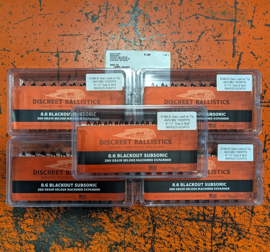 Discreet Ballistics 280gr 8.6BLK Selous subsonic is now available in 16″, 12″, and 8″ barrel length velocities – keeping speeds around 1000fps at the muzzle. Additionally, projectiles can be specified as either Bolt Gun OR Gas Gun. All loaded ammunition will come as tipped unless otherwise specified in your order comments.